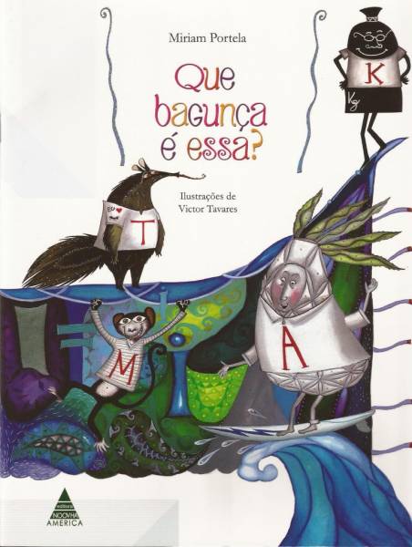 A narrativa de Que bagunça é essa?, de Miriam Portela, é construída por rimas, apresentando uma ilustração bastante peculiar, cada letra é um animal ou objeto, vestindo a camiseta com a letra que representa: A de abacaxi, B de bola, C de cachorro, e assim por diante, na sequência alfabética Como protagonista, o Sr. Abecedário comanda a trupe de personagens constituída pelas letras e o dicionário.
